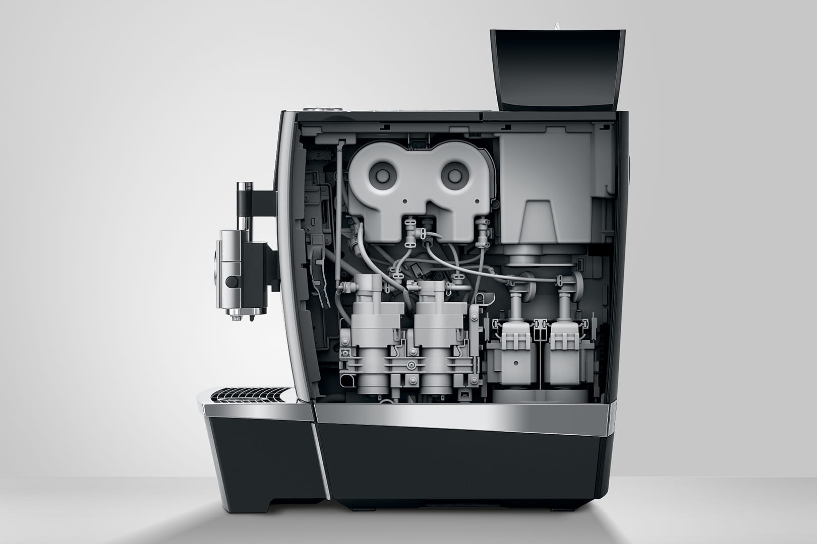 Konserwacja nowego ekspresu GIGA X8 jest tak samo prosta, logiczna i intuicyjna, jak jego obsługa. Oryginalne produkty do konserwacji JURA oraz zintegrowane programy płukania i czyszczenia dbają za naciśnięciem jednego przycisku o higienę, posiadającą certyfikat TÜV. Również czyszczenie systemu mlecznego wyróżnia się przemyślaną konstrukcją. W pełni zautomatyzowane i uruchamiane za dotknięciem wyświetlacza gwarantuje zachowanie perfekcyjnej czystości w kontakcie z mlekiem. Masywna podwójna wylewka da się rozłożyć paroma ruchami. Umieszczone z przodu wylewki wyloty przewodów na mleko są łatwo dostępne i w razie potrzeby można je wymienić w bardzo prosty sposób.