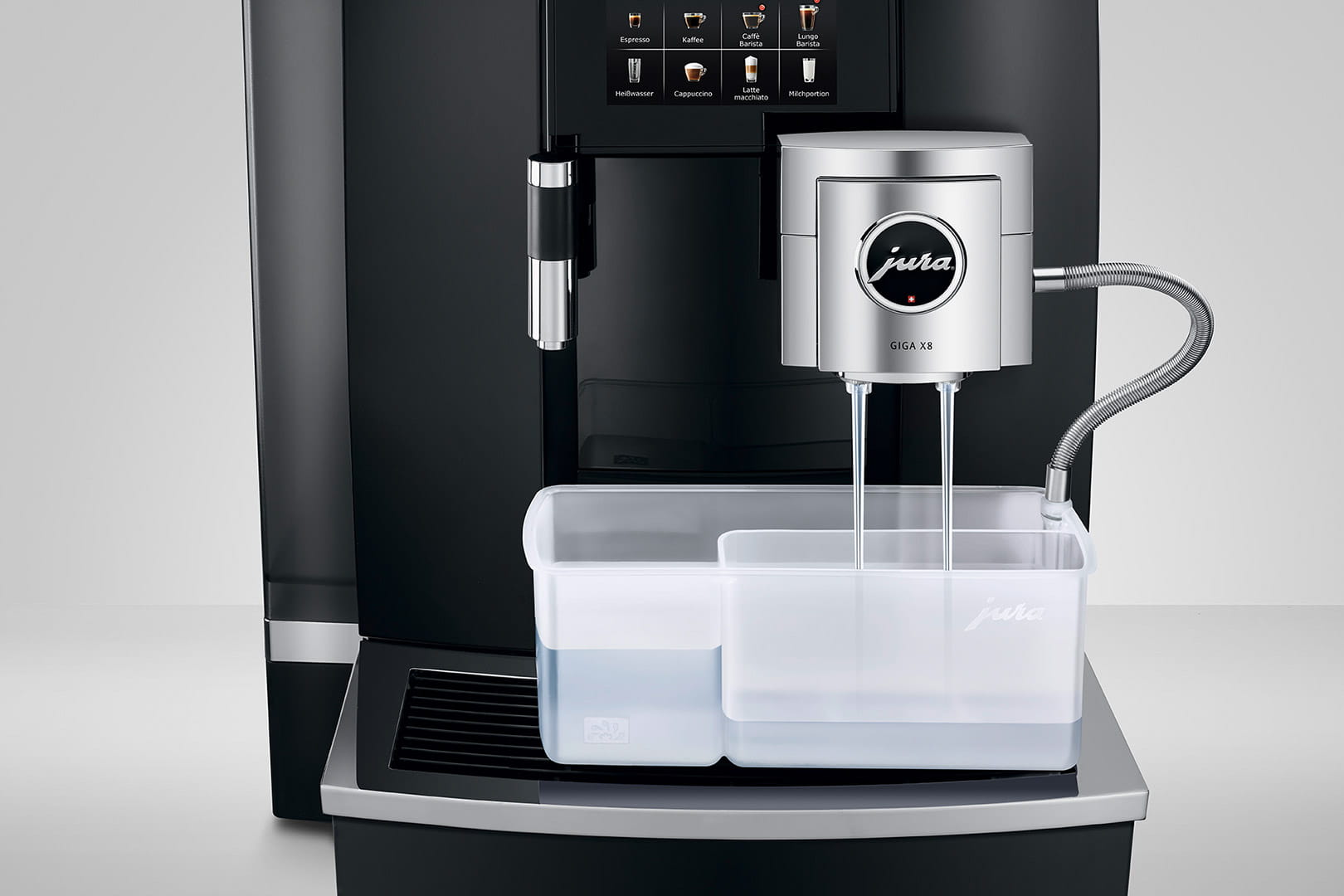 Konserwacja nowego ekspresu GIGA X8 jest tak samo prosta, logiczna i intuicyjna, jak jego obsługa. Oryginalne produkty do konserwacji JURA oraz zintegrowane programy płukania i czyszczenia dbają za naciśnięciem jednego przycisku o higienę, posiadającą certyfikat TÜV. Również czyszczenie systemu mlecznego wyróżnia się przemyślaną konstrukcją. W pełni zautomatyzowane i uruchamiane za dotknięciem wyświetlacza gwarantuje zachowanie perfekcyjnej czystości w kontakcie z mlekiem. Masywna podwójna wylewka da się rozłożyć paroma ruchami. Umieszczone z przodu wylewki wyloty przewodów na mleko są łatwo dostępne i w razie potrzeby można je wymienić w bardzo prosty sposób.