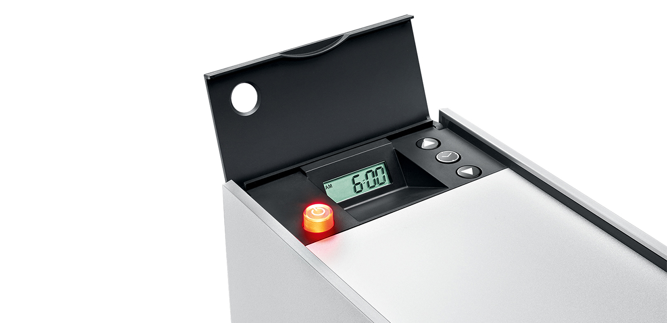 Możliwość indywidualnego programowania czasu włączenia i wyłączenia to doskonały przykład eko-inteligencji tego nowoczesnego urządzenia. Pracę podgrzewacza można łatwo dostosować do swoich potrzeb, aby podgrzał filiżanki dokładnie wtedy, gdy będą nam potrzebne i byśmy mogli cieszyć się ulubioną poranną kawą. Jeśli w urządzeniu nie zaprogramowano czasu wyłączenia - aby oszczędzać cenną energię, podgrzewacz wyłączy się automatycznie po 12 godzinach pracy.
