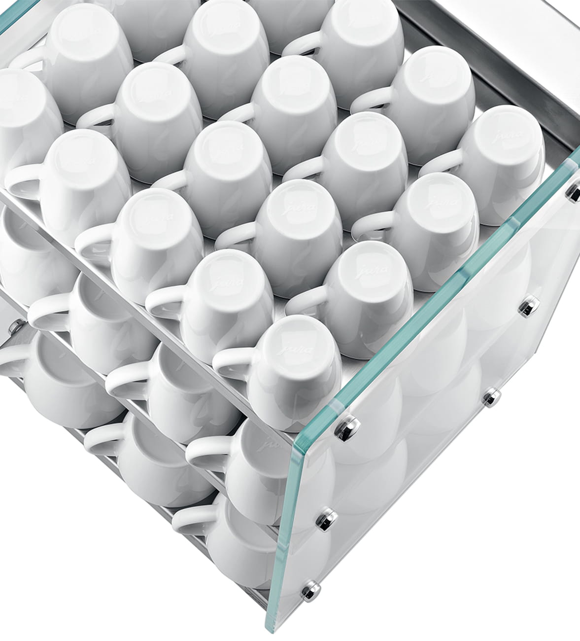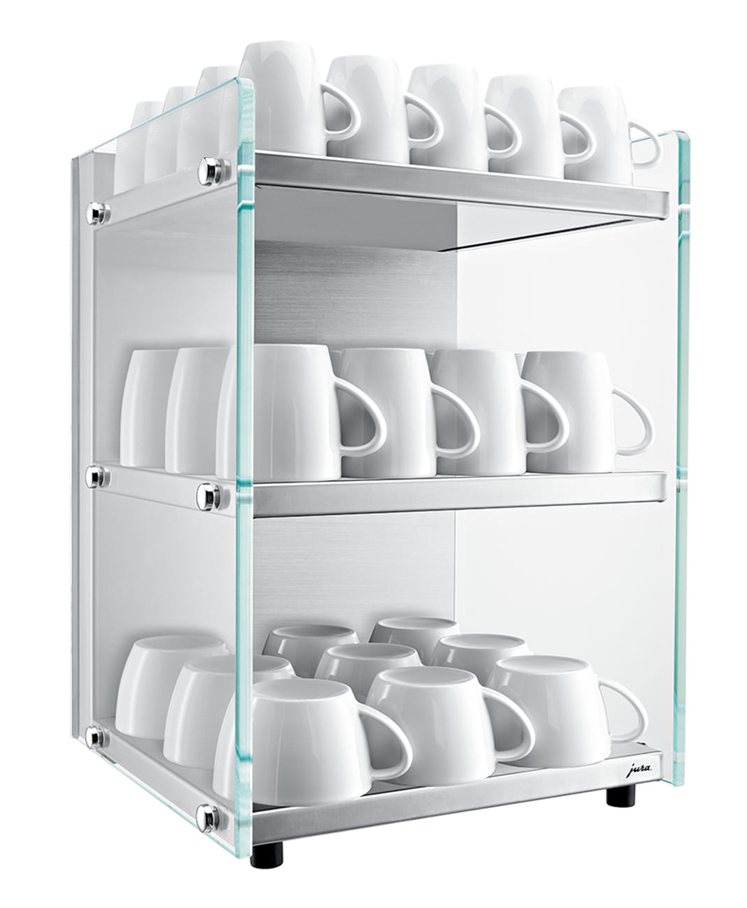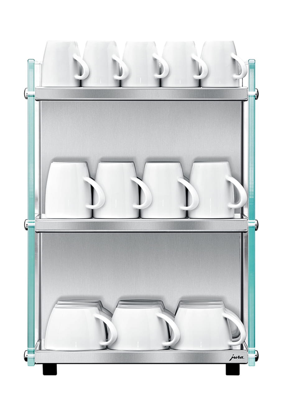 Podgrzewacz do filiżanek wykonany ze stali szlachetnej, wykończony wysokiej jakości elementami z białego szkła, swoją lekką formą doskonale współgra ze wszystkimi modelami GIGA Professional oraz X8/X6.